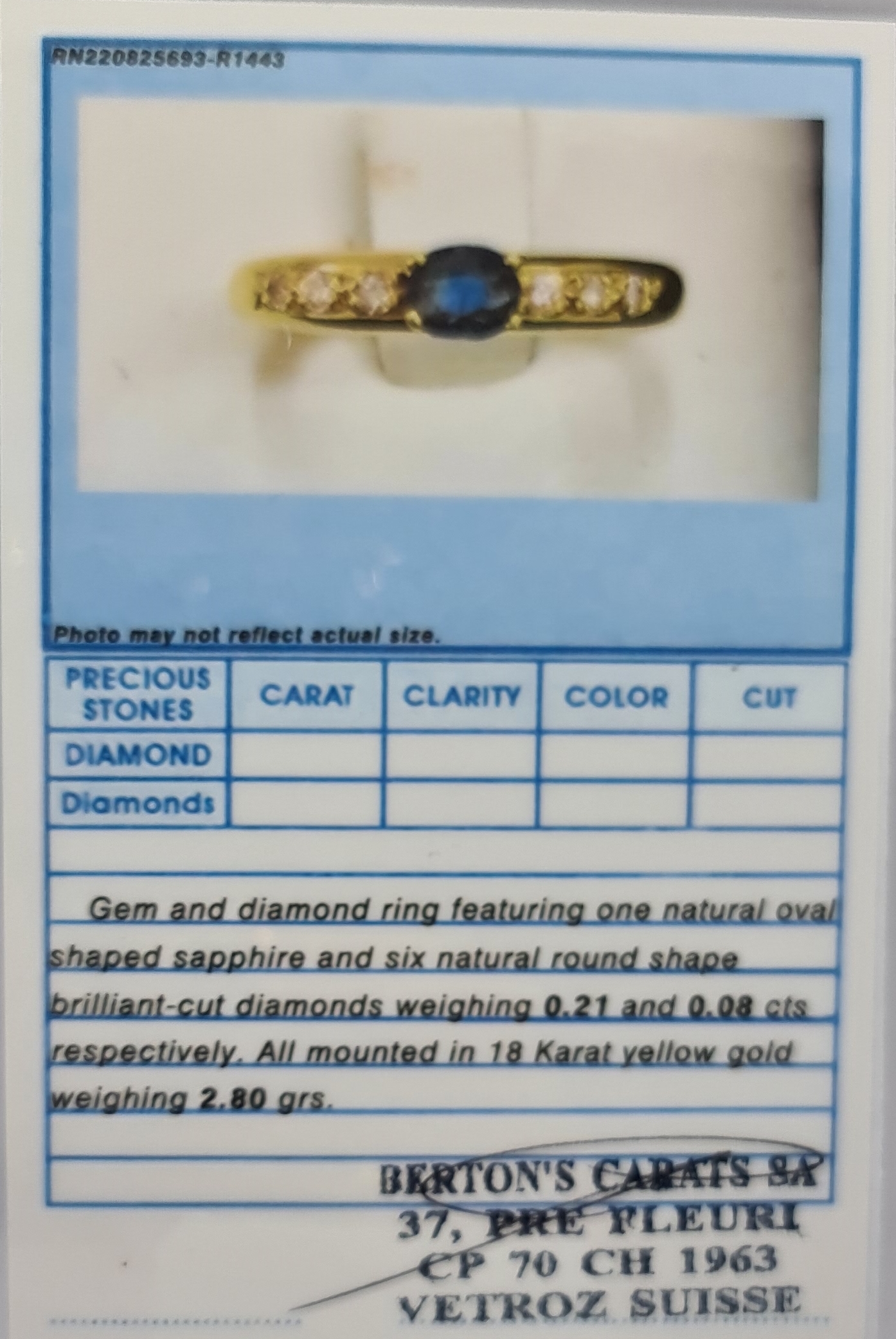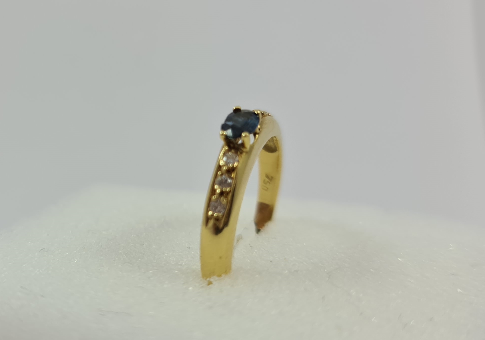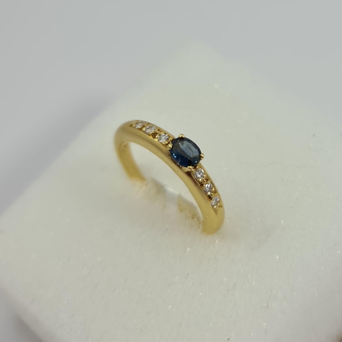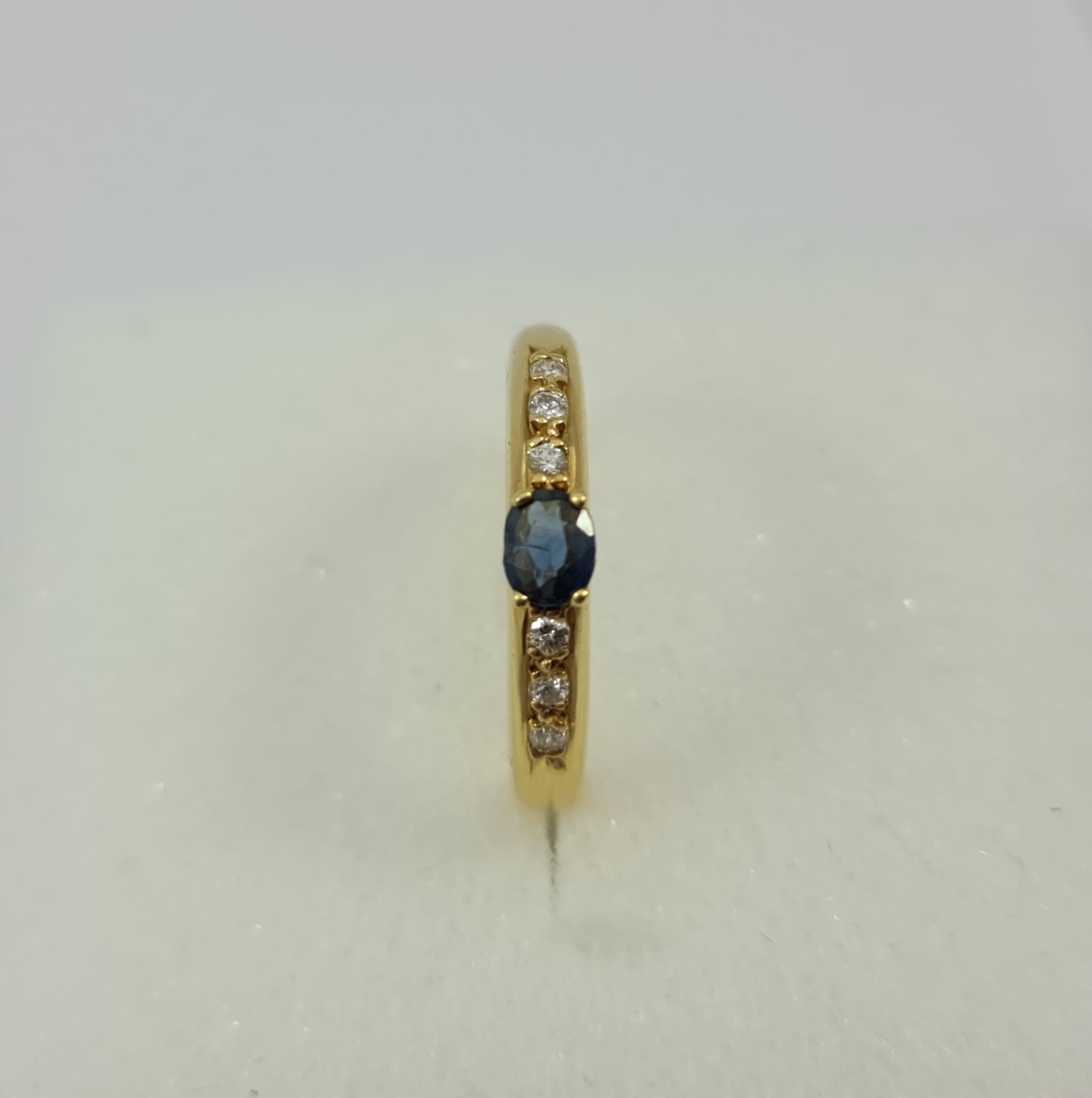 Gem and diamond ring featuring one natural oval shaped sapphire and six natural round shape brilliant-cut diamonds weighing 0.21 and 0.08 cts respectively. All mounted in 18 Karat yellow gold weighing 2.80 grs.