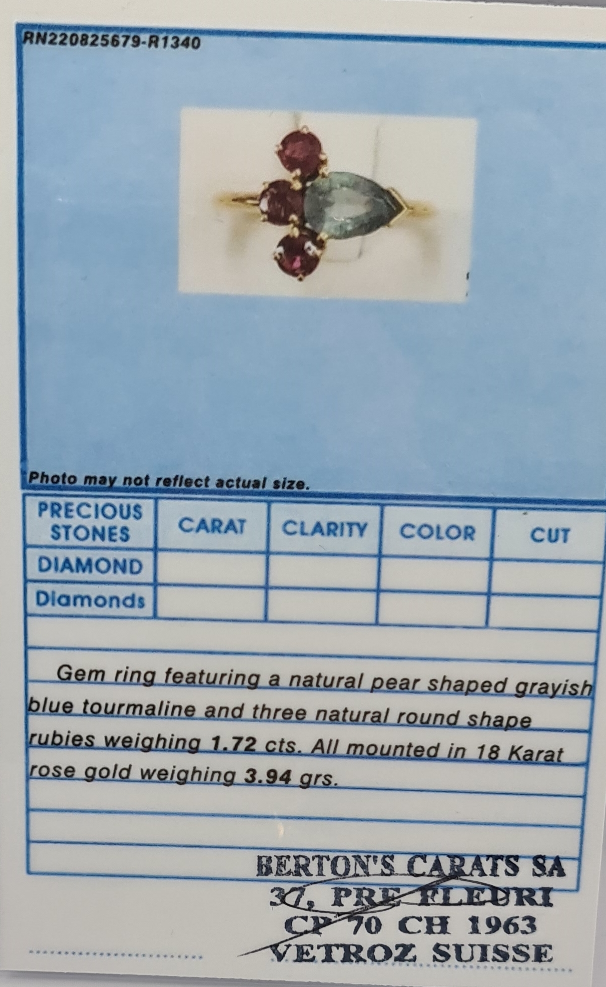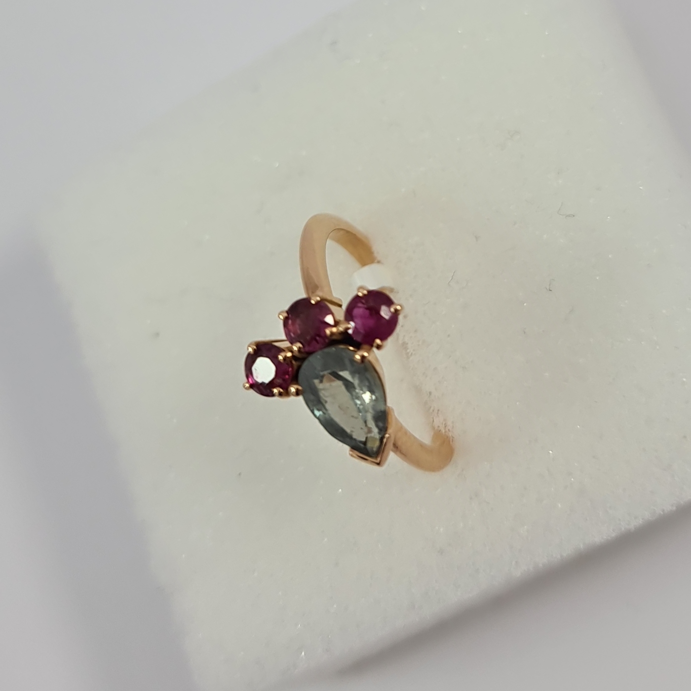 Gem ring featuring a natural pear shaped grayish blue tourmaline and three natural round shape rubies weighing 1.72 cts. All mounted in 18 Karat rose gold weighing 3.94 grs.