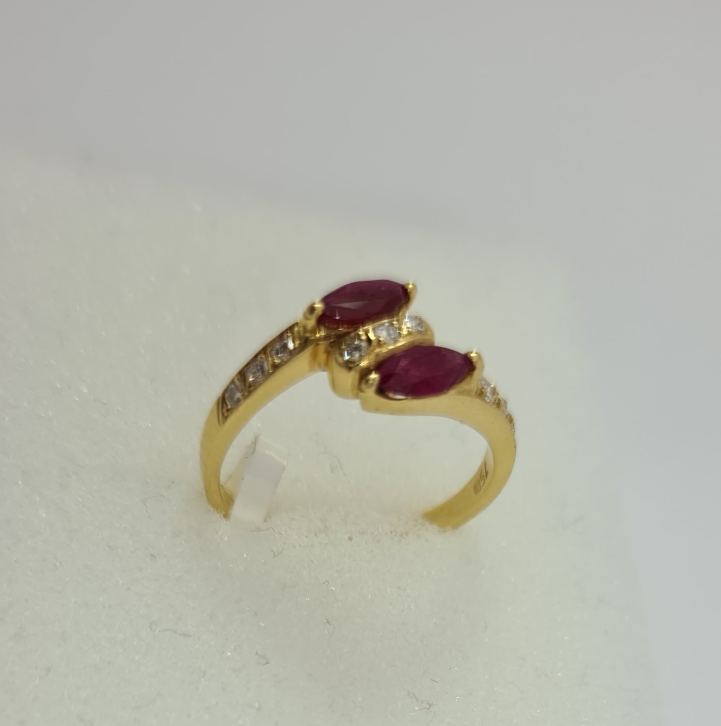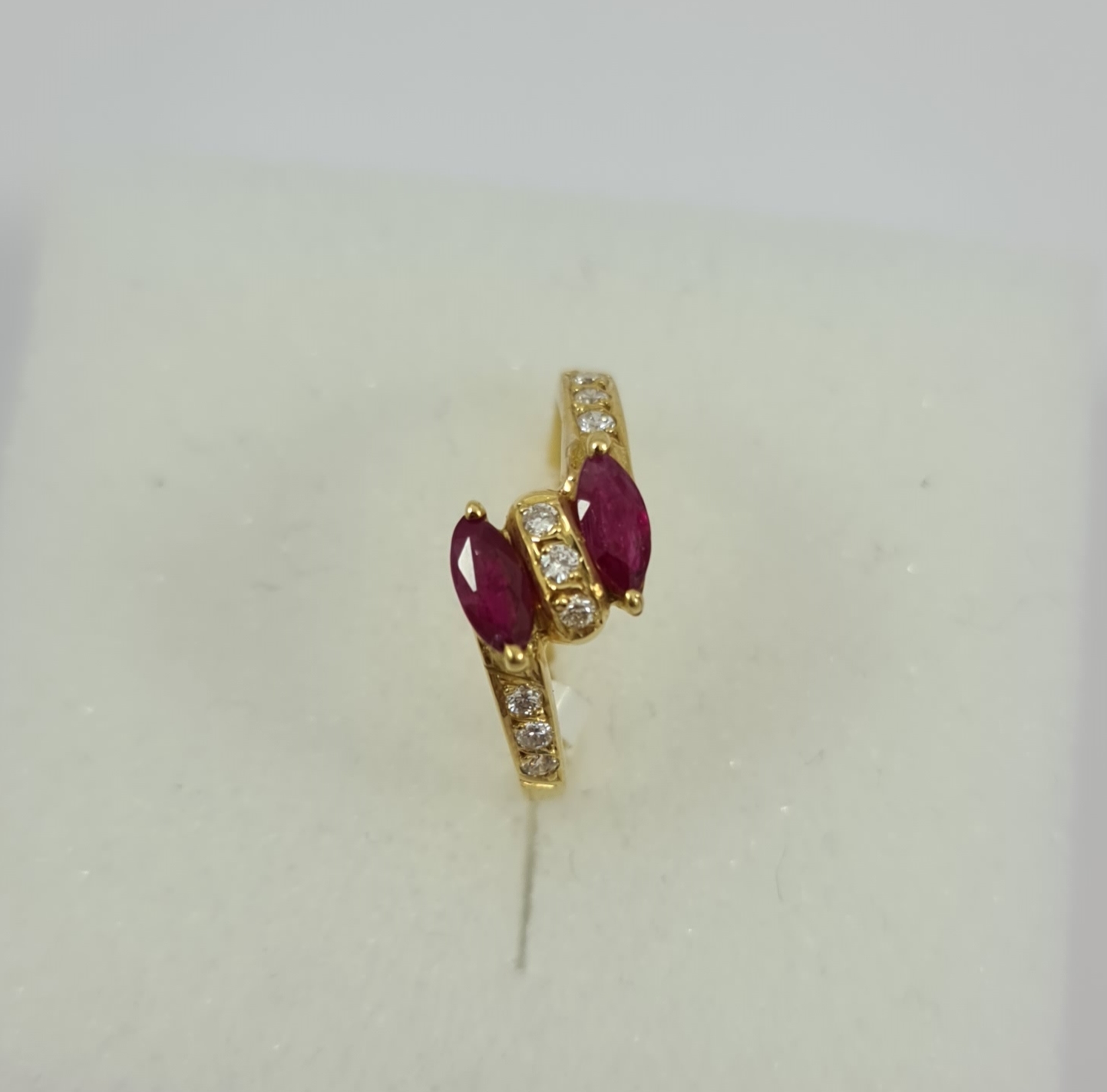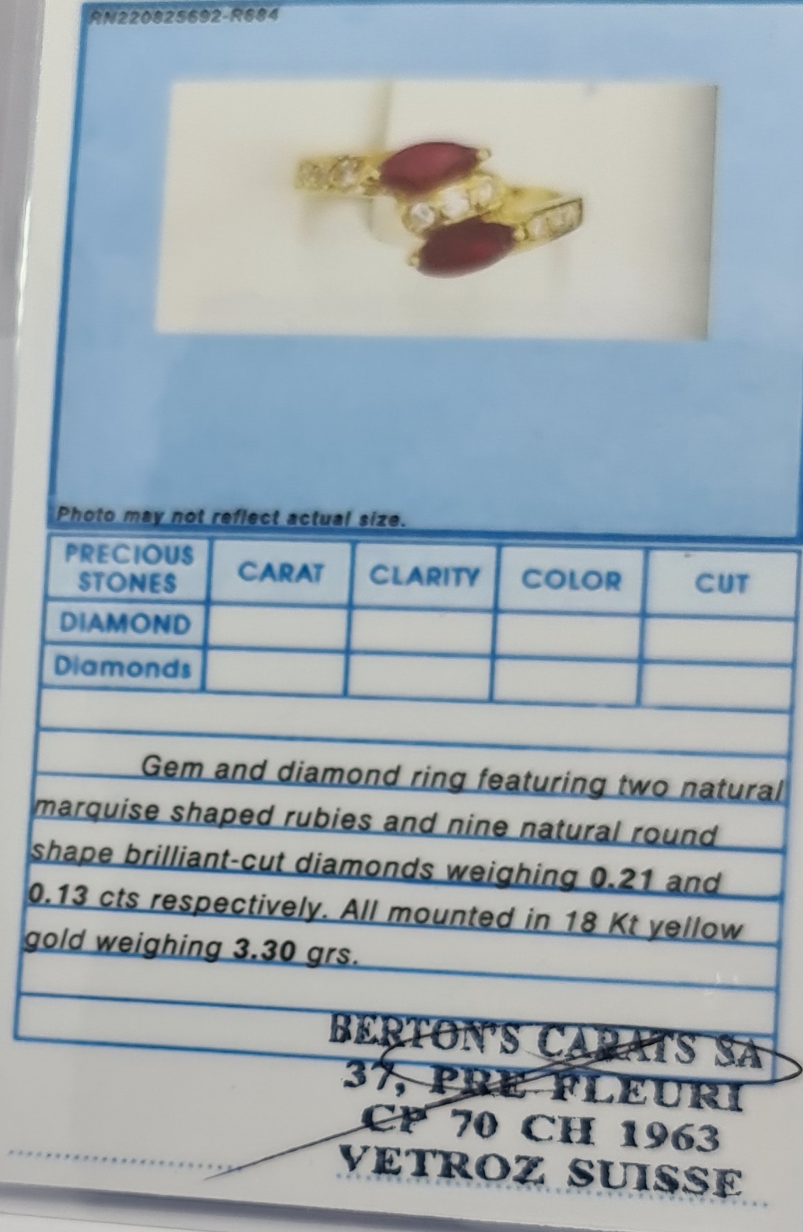 Gem and diamond ring featuring two natural marquise shaped rubies and nine natural round shape brilliant-cut diamonds weighing 0.21 and 0.13 cts respectively. All mounted in 18 Kt yellow gold weighing 3.30 grs