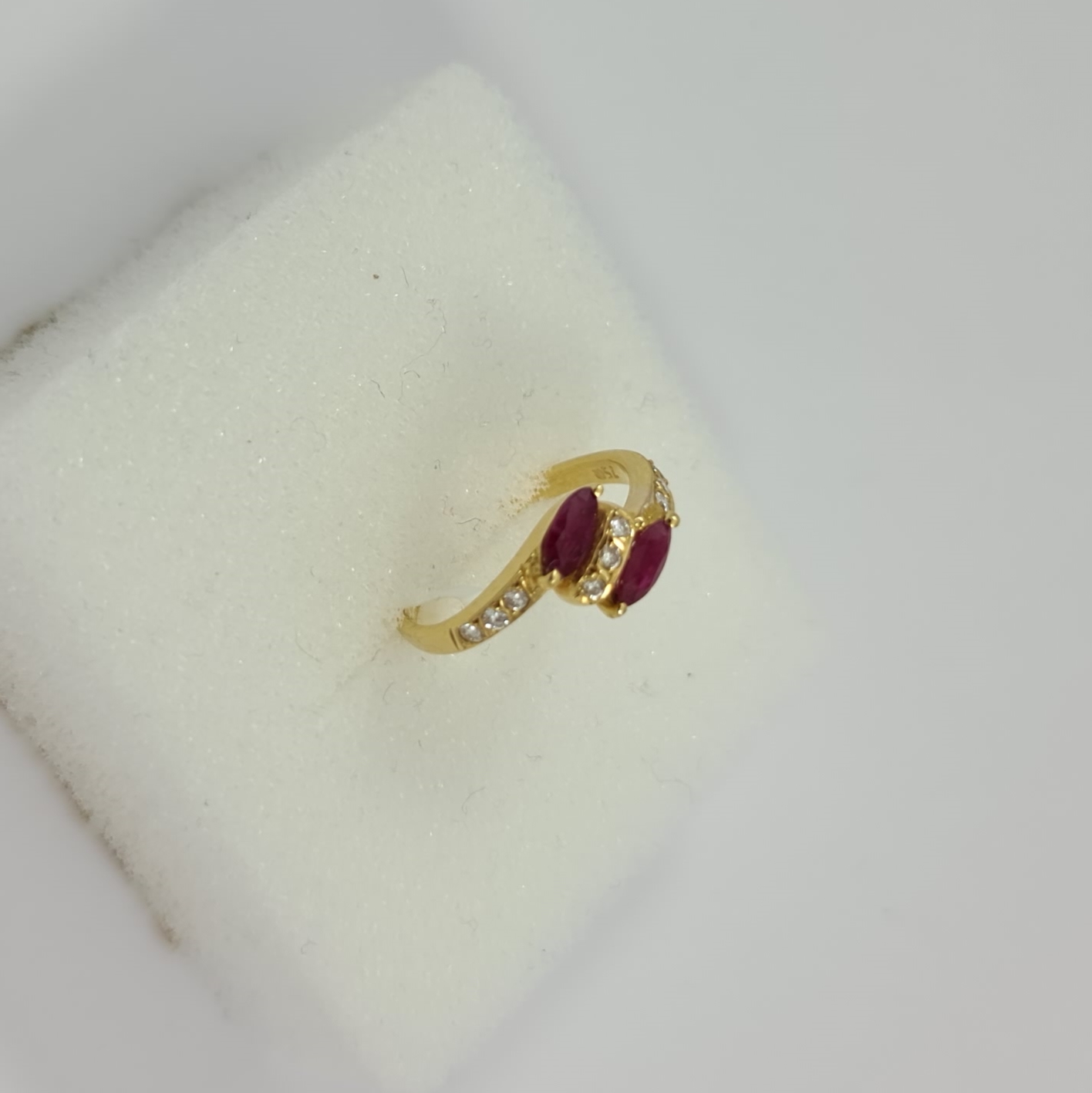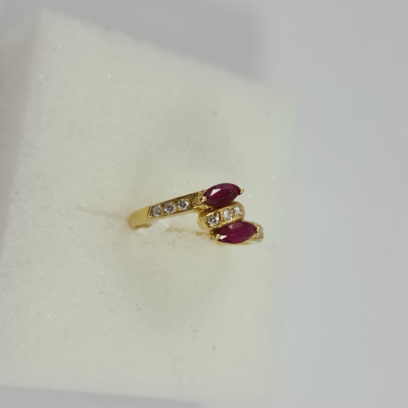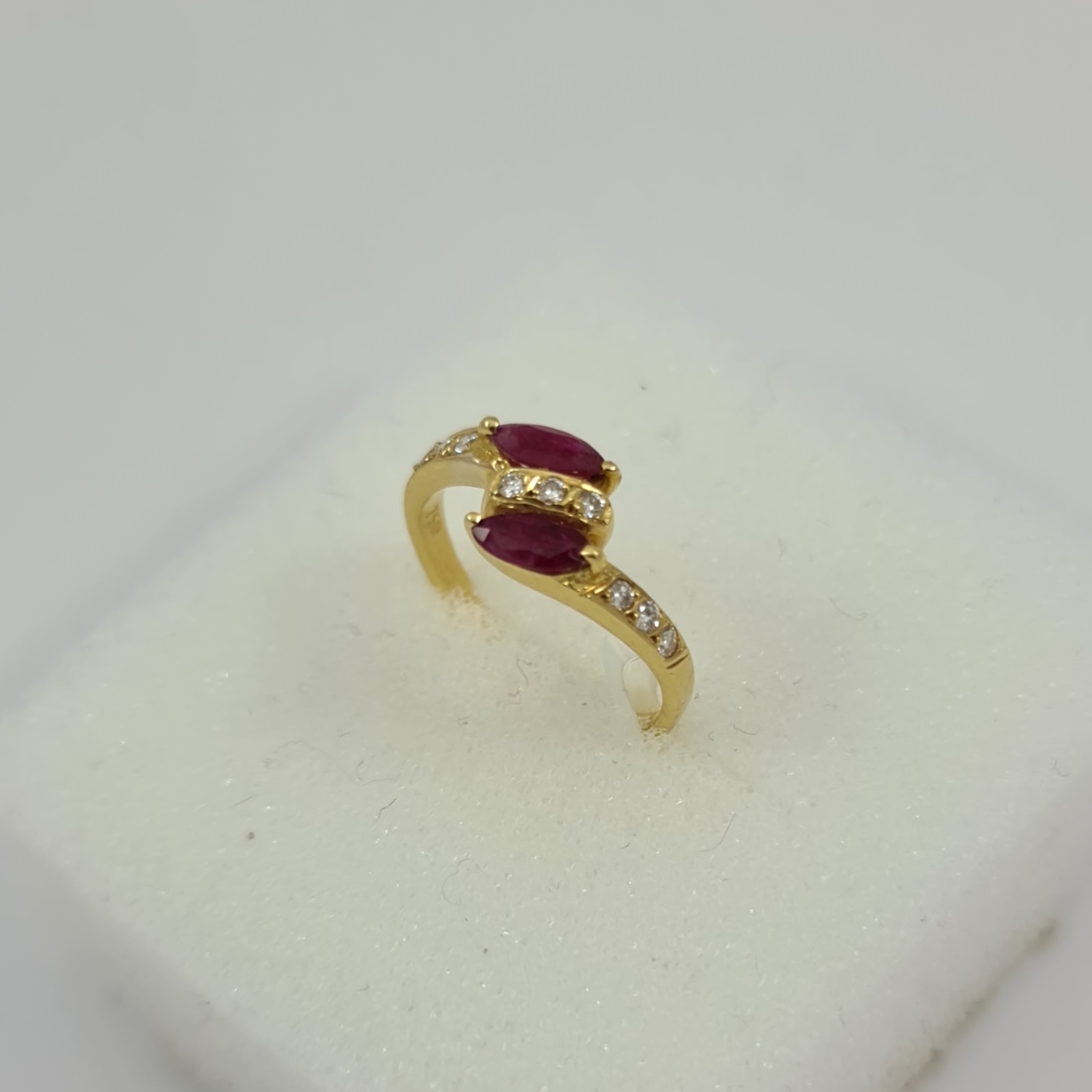 Gem and diamond ring featuring two natural marquise shaped rubies and nine natural round shape brilliant-cut diamonds weighing 0.21 and 0.13 cts respectively. All mounted in 18 Kt yellow gold weighing 3.30 grs