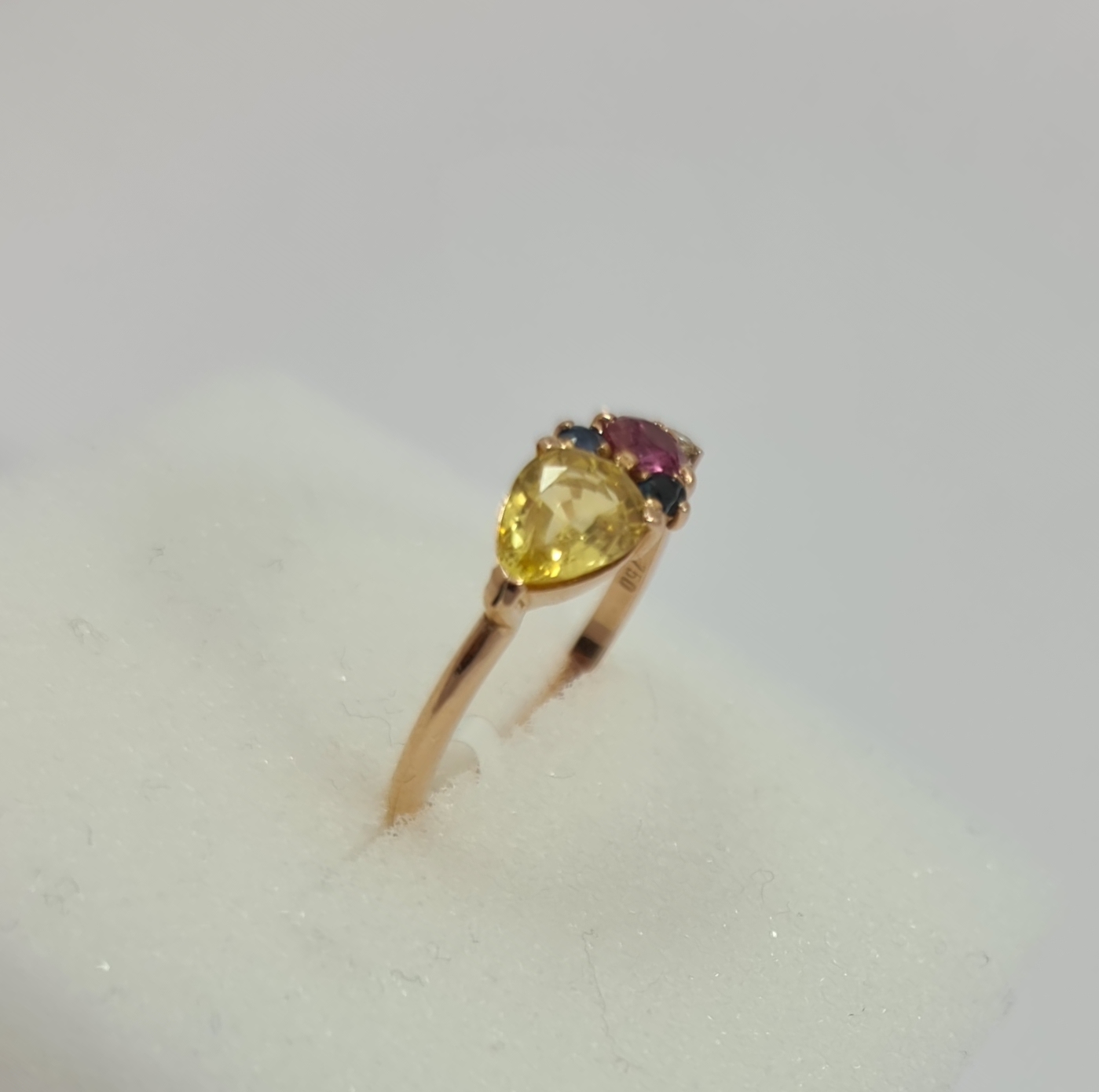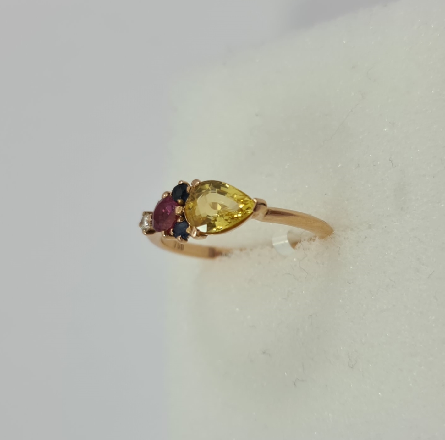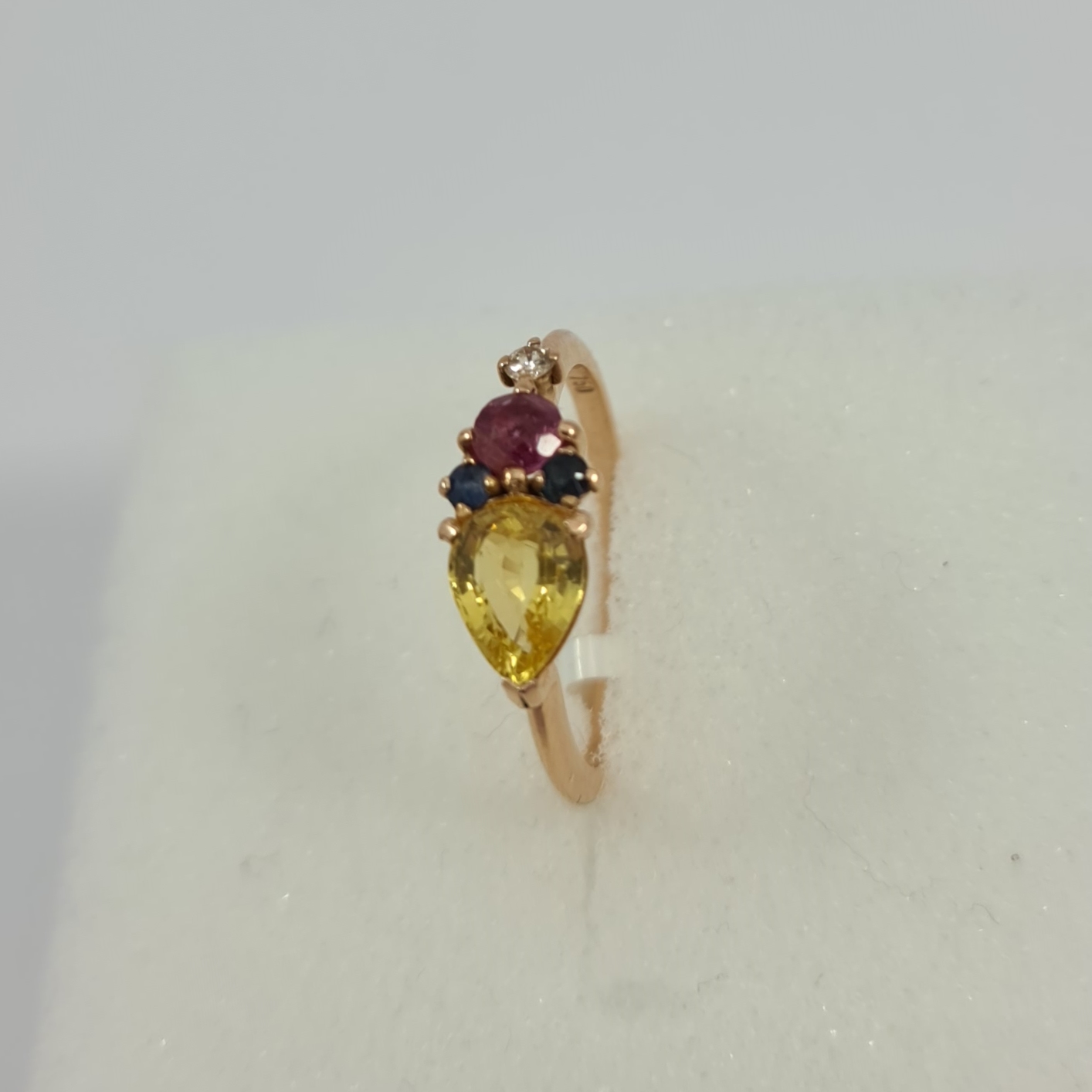 Gem and diamond ring featuring a natural pear shaped yellow sapphire, two natural round shape blue sapphires, one natural round shape ruby and one natural shape brilliant-cut diamond weighing 0.89 and 0.09 carats respectively. All mounted in18Kt rose gold weighing 2.72 grs.
