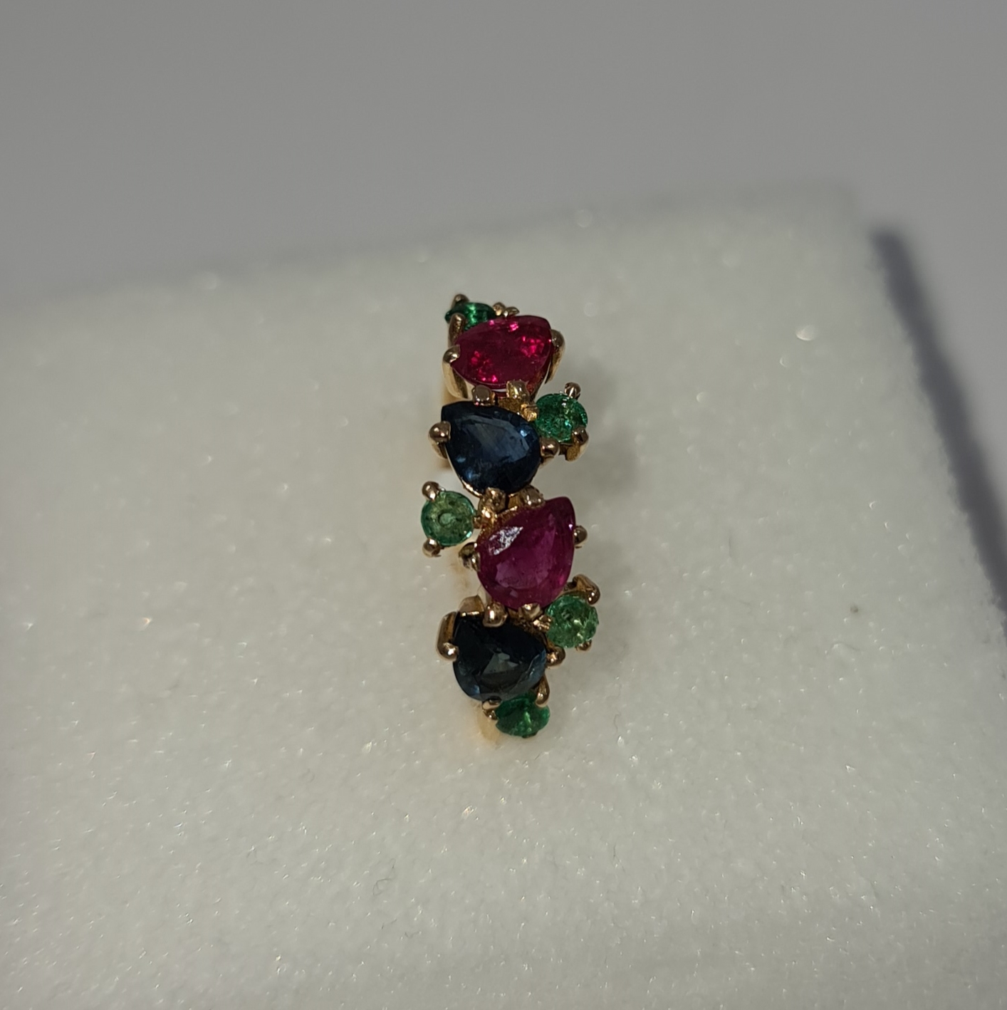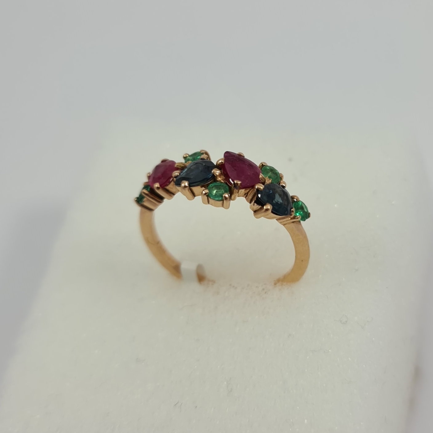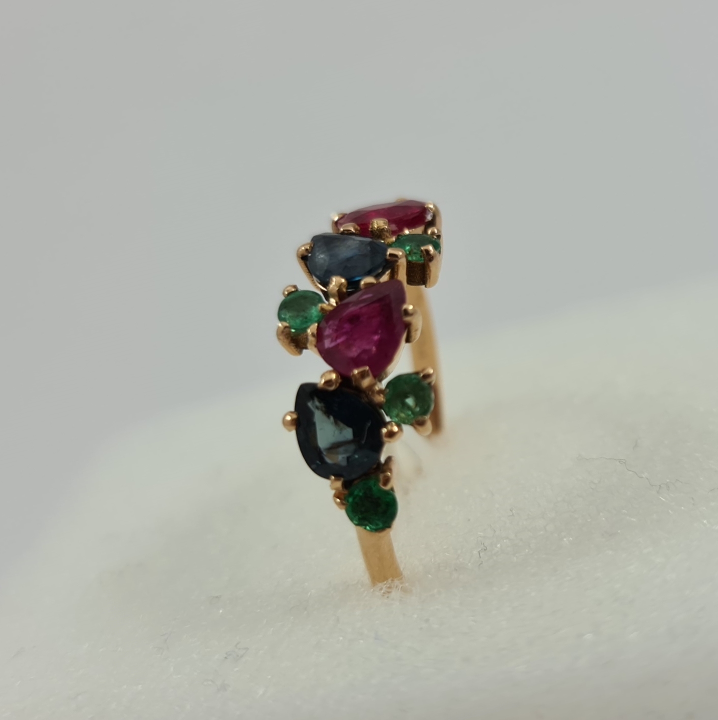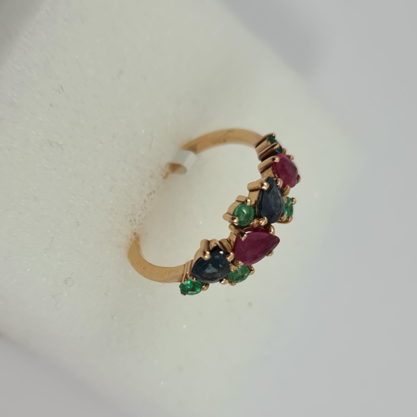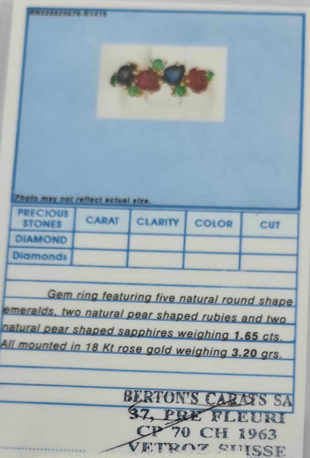 Gem ring featuring five natural round shape emeralds, two natural pear shaped rubies and two natural pear shaped sapphires weighing 1.65 cts. All mounted in 18 Kt rose gold weighing 3.20 grs.